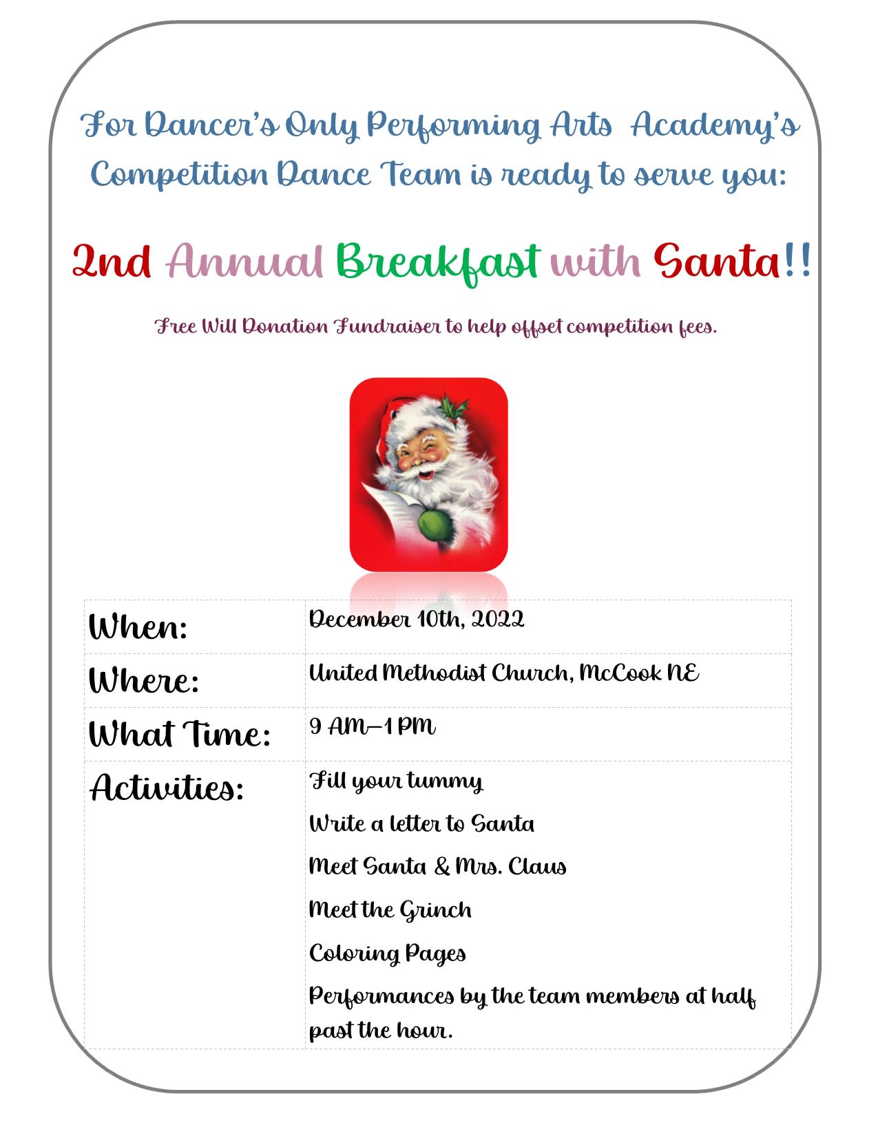 For Dancer's Only Performing Arts Academy's Competition Dance Team is hosting a fundraiser to help offset competition costs. Kids of all ages will be able to enjoy breakfast, write a letter to Santa, see Santa, Mrs. Claus and the Grinch. We will also have the team members performing on the half hour.