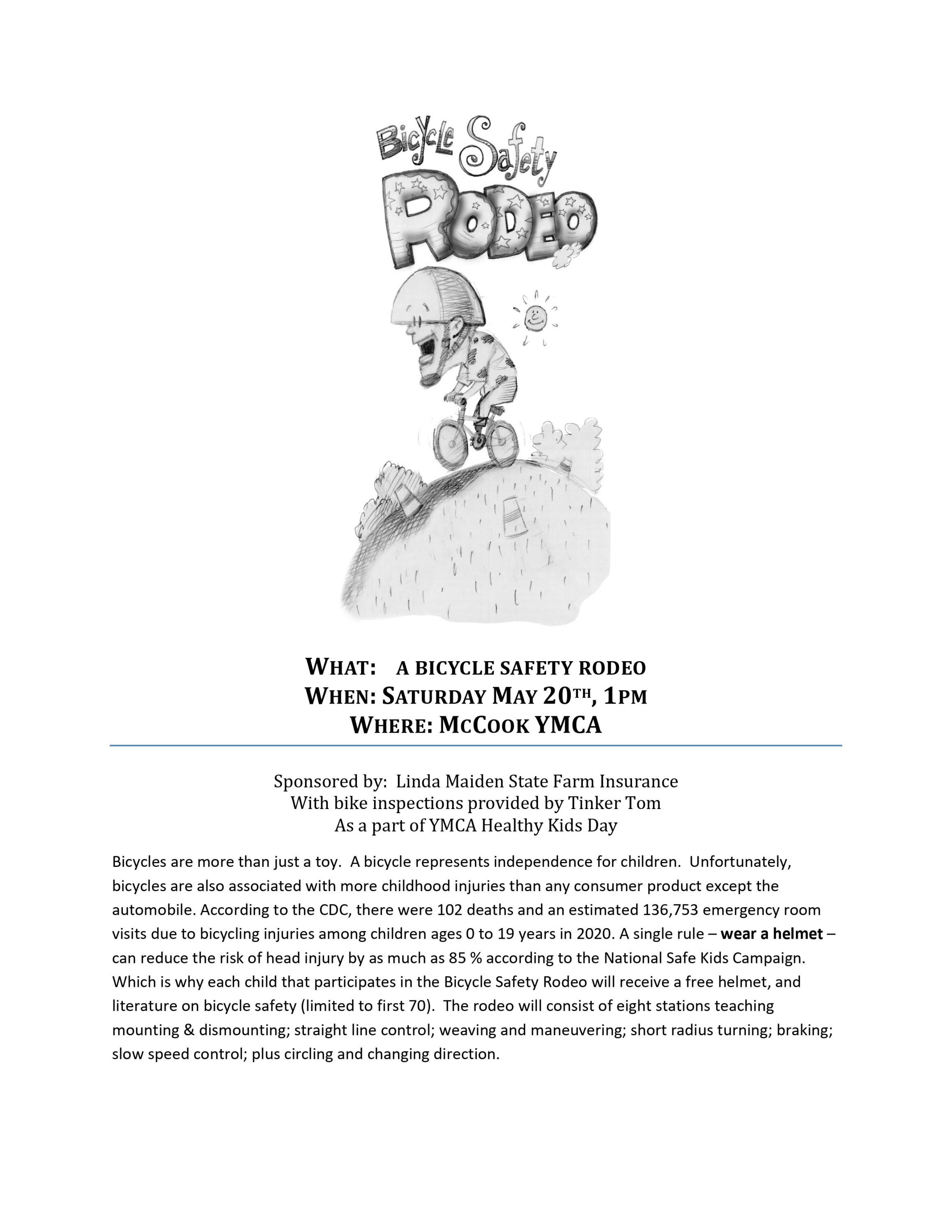 The rodeo will consist of eight stations teaching mounting & dismounting; straight line control; weaving and maneuvering; short radius turning; braking; slow speed control; plus circling and changing direction. Each child that participates in the Bicycle Safety Rodeo will receive a free helmet, and literature on bicycle safety (limited to first 70).