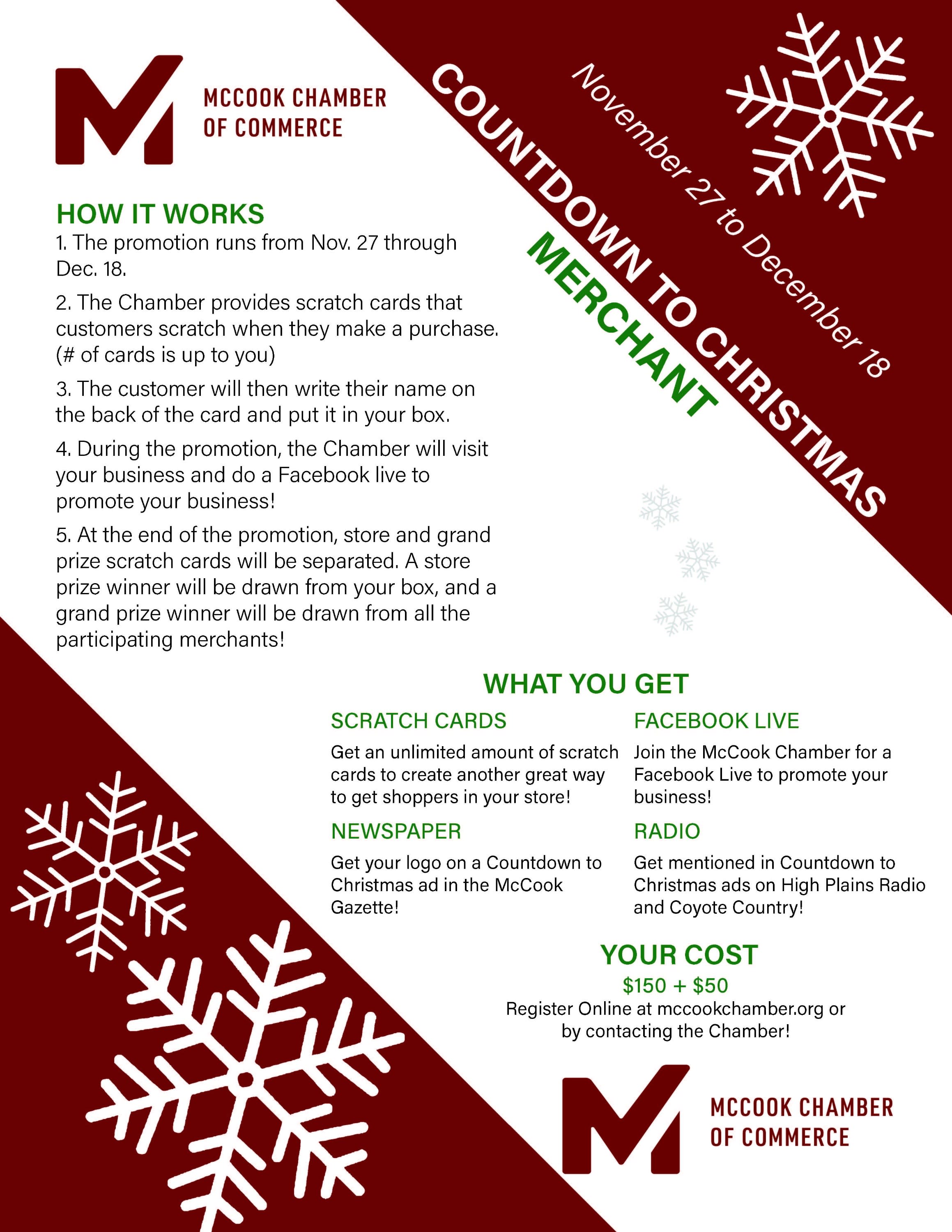 The McCook Chamber of Commerce wants to encourage you to shop locally this Christmas shopping season! That's why we're bringing back the Countdown to Christmas Promotion again this year. The format will remain the same as last year with Facebook Live streams taking place at participating businesses the first three weeks in December. Scratch off cards will be available at participating merchants that enter you to win a $50 gift certificate to the business or the grand prize of $500 in Chamber Bucks!